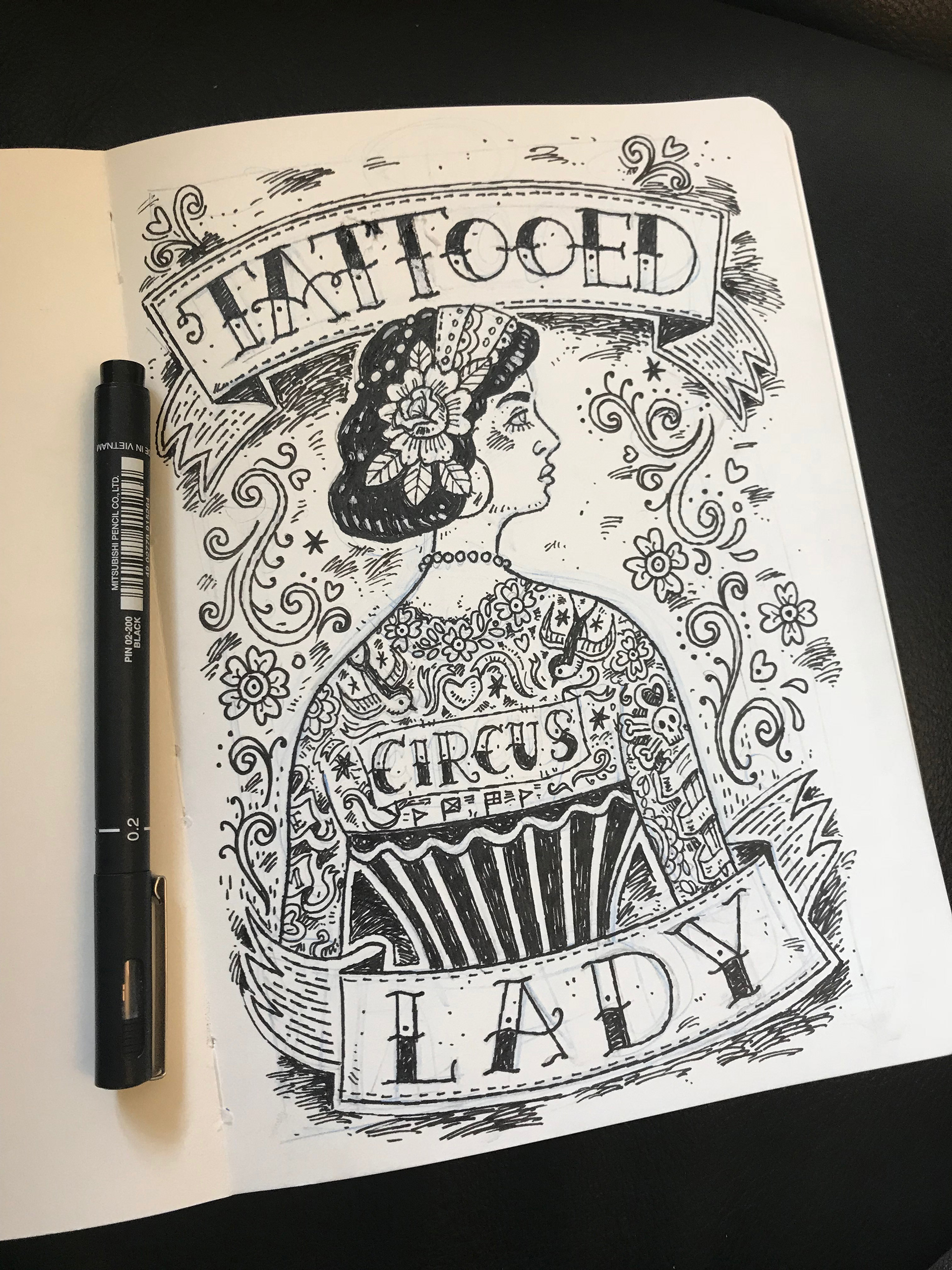 Sketchbook - Tattooed Lady - fibre tip pen over pencil