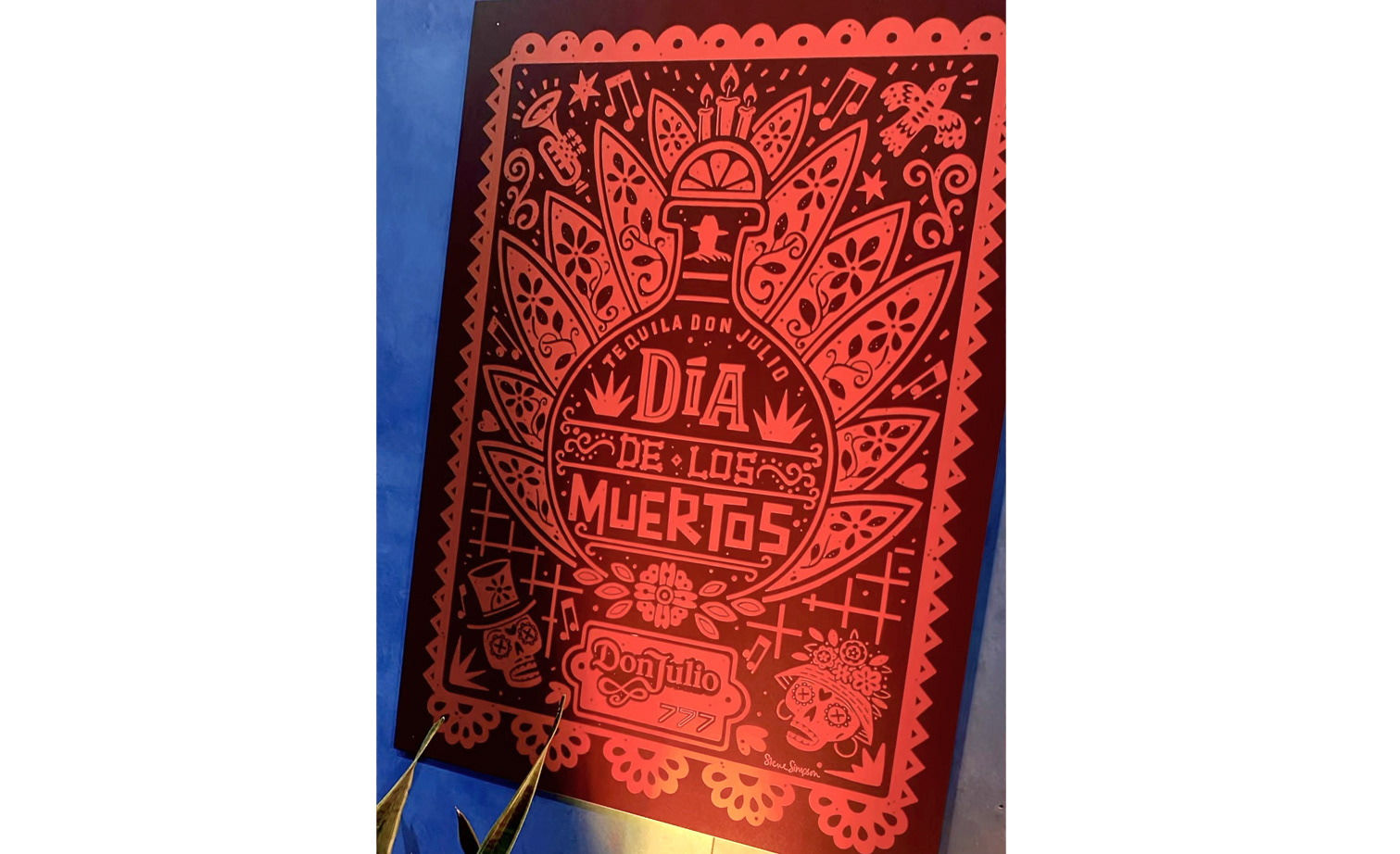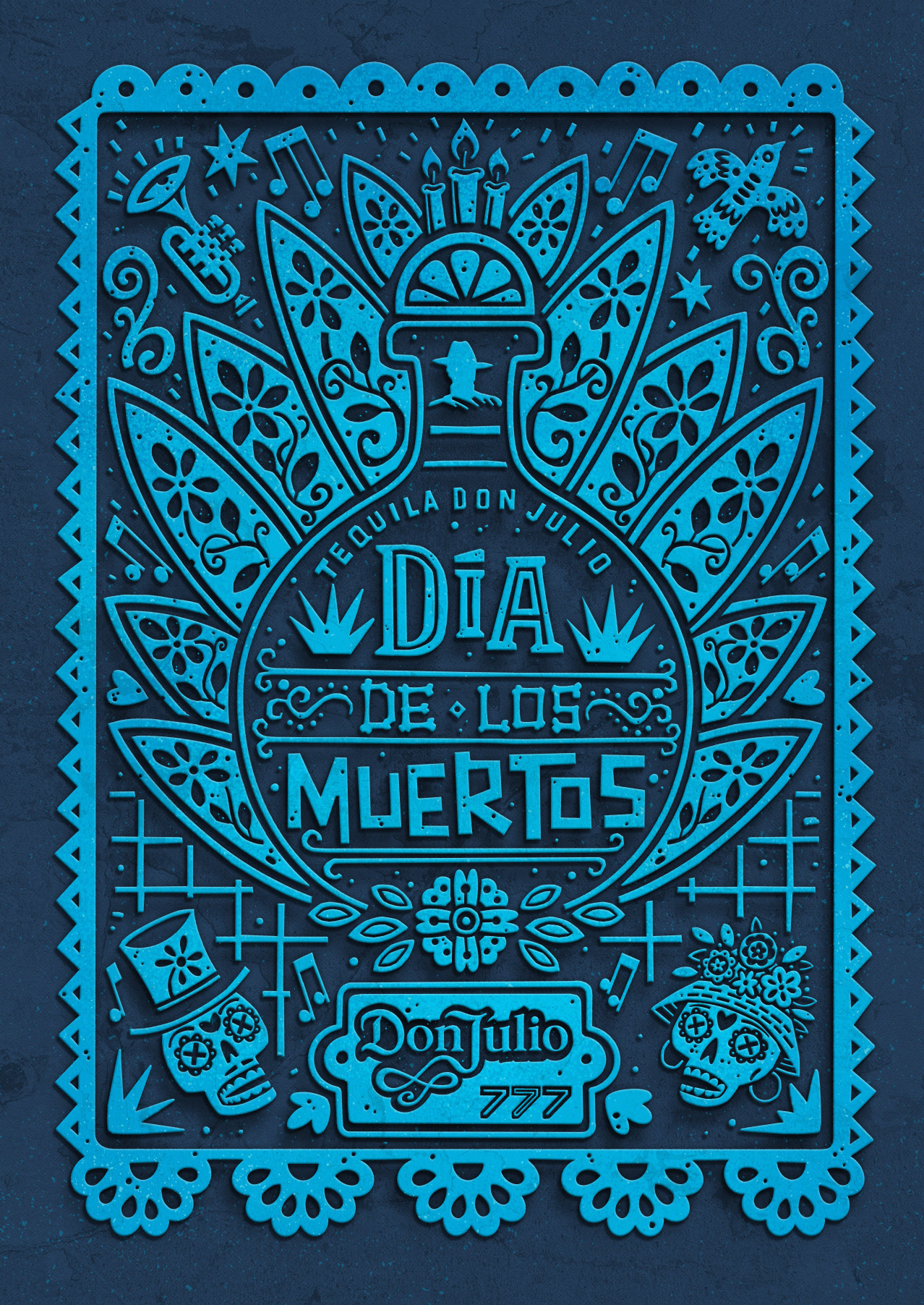 My final papel picado inspired design features the usual day of the dead calaveras, musical instrument, musical notes, flowers and candles. Representing the brand, I've included the iconic bottle shape sitting in front of an agave, a slice of lime, Don Julio hat and logo