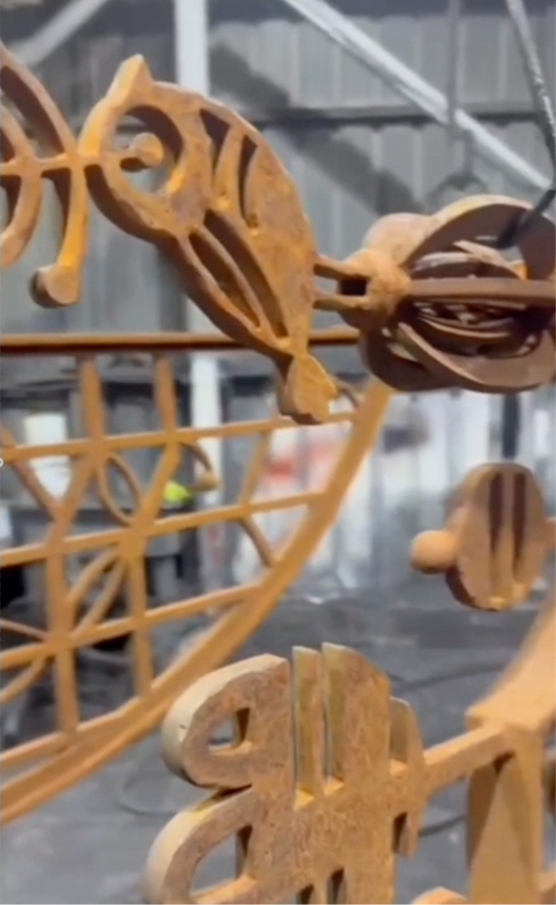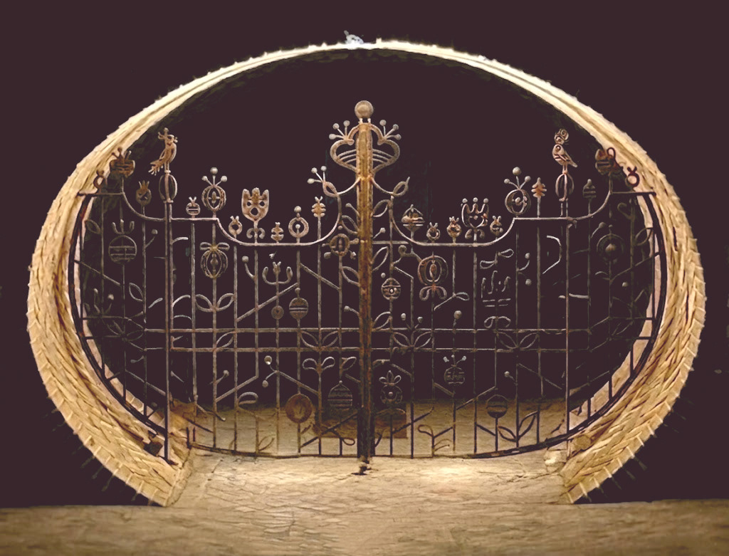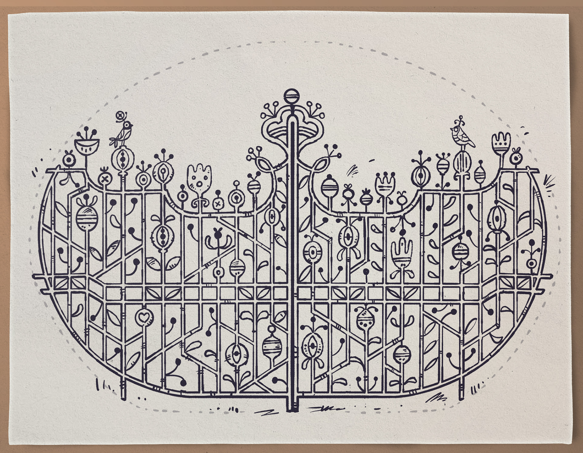 The gate was fabricated by metalworker Barry McCann, translating the drawn forms into forged and cut steel elements.