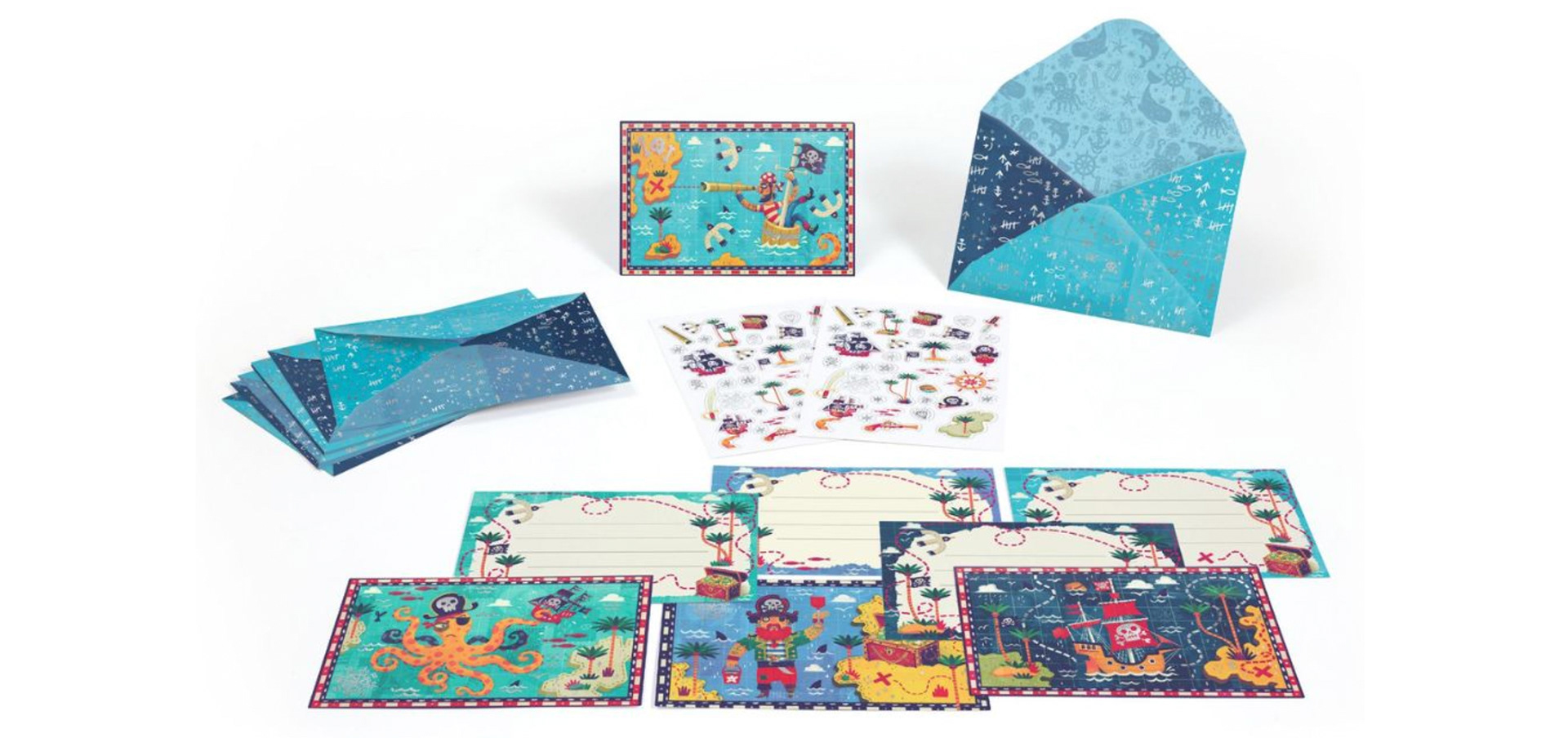 The set includes 4 illustrated invitation cards, matching envelopes, and 2 sticker sheets. .
