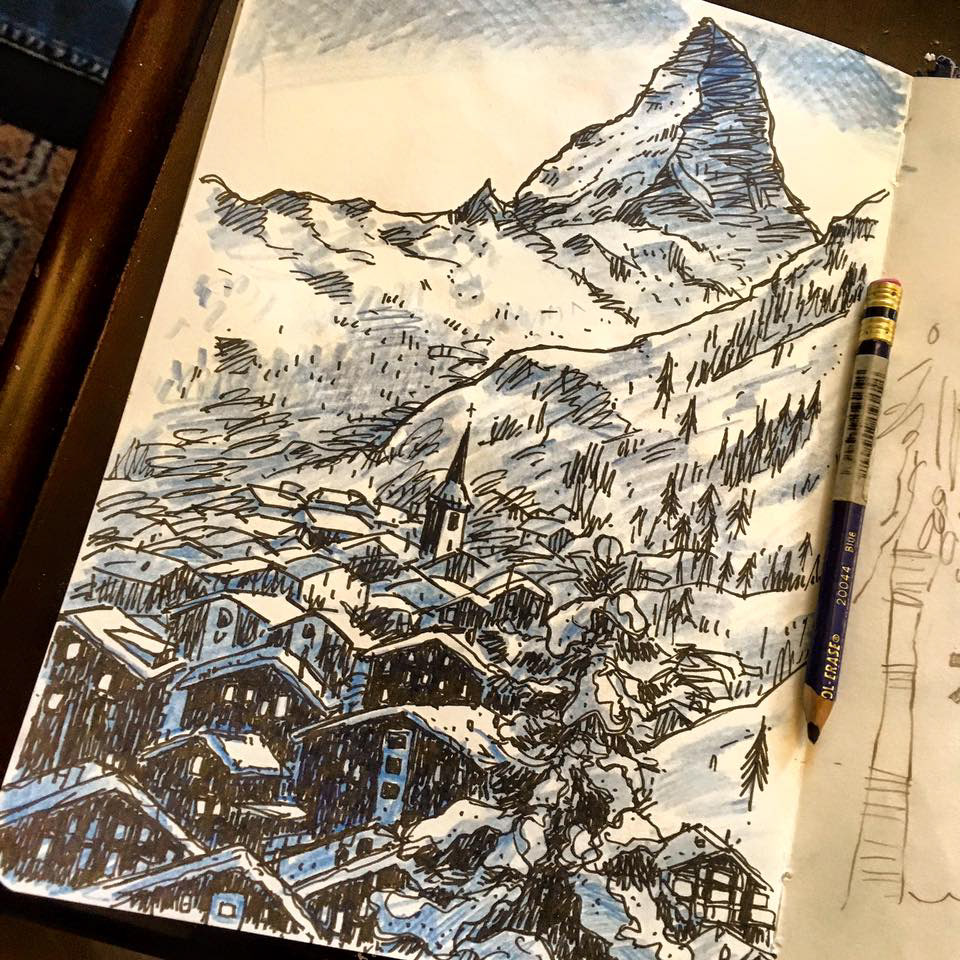 6 February 2016 - The Matterhorn from Zermatt - marker and blue pencil over fibre tip