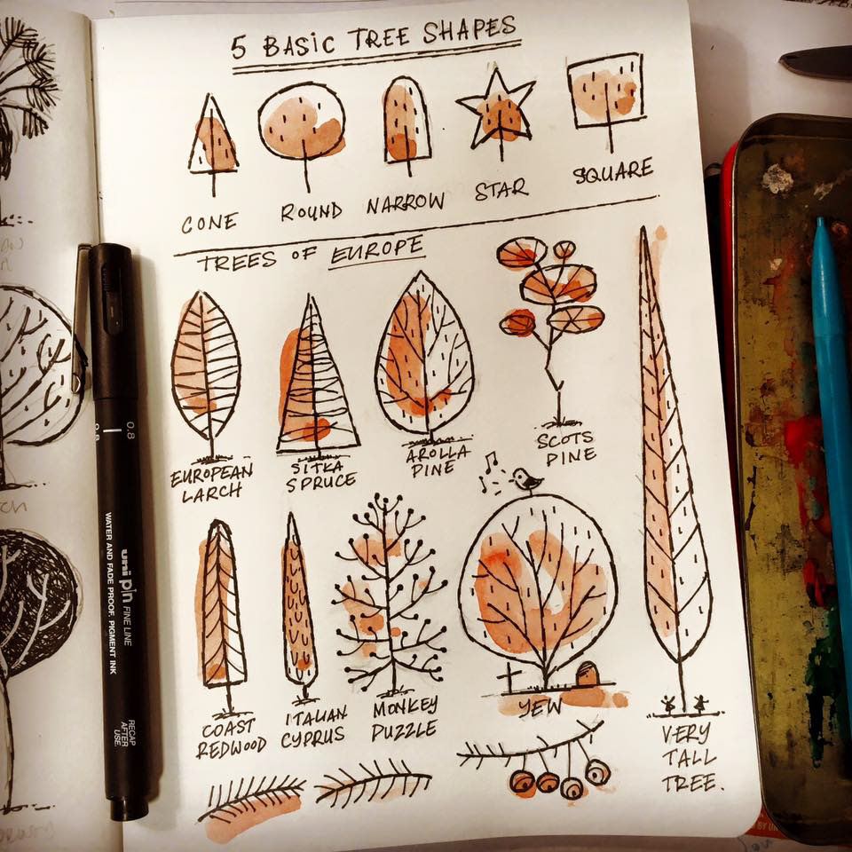 14th March 2016 - Exploration and expansion on the 3 basic tree shapes - .2 & .8 Unipin Fineliner over pencil - finger paintined with watercolours - sketchbook: Flexbooks