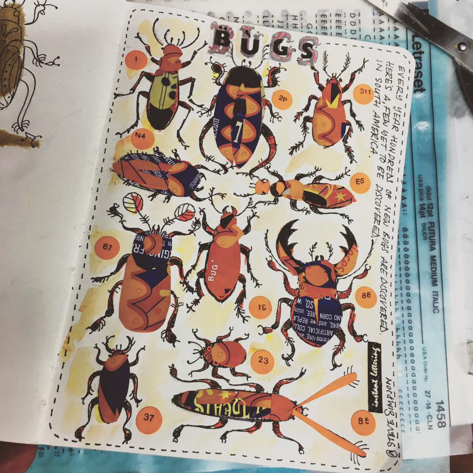playing around with bugs, collage, fibre tips, watercolour and a little Letraset
