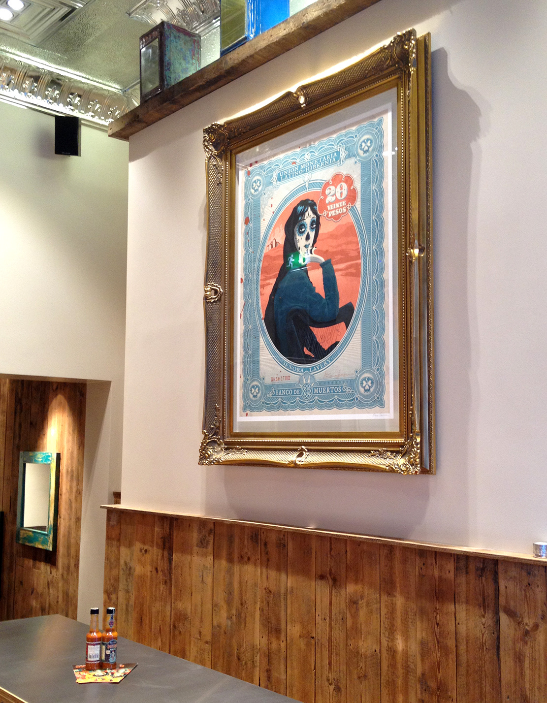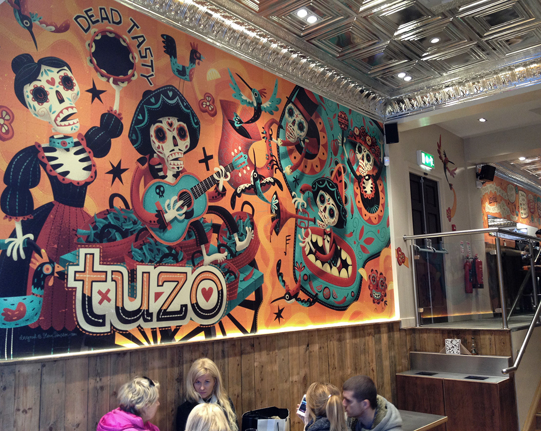 Tuzo's is a newly opened burrito bar in the centre of Dublin. I was initially commissioned to create an 18ft mural (digitally) to cover the main wall of the restaurant. This work led to a few other pieces including the Mexican Kitchen sign and pre-order menu. They also purchased a large print of my Señora Lavery for another wall.